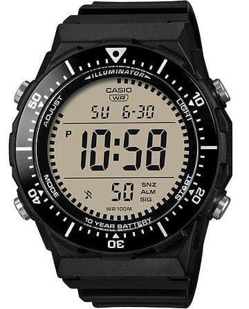 Casio Collection AE-1700H-1A - спортивные кварцевые часы с цифровым экраном крупного формата. Чёрный пластиковый корпус, такой же ремешок на стандартной застёжке, посадка лёгкая за счёт небольшого веса. Безель поворотный с алюминиевой вставкой с IP-покрытием . Водозащита WR100, можно плавать и нырять. Подсветка дисплея реализована через светодиодную подсветку . Есть второй часовой пояс , переключение между 12- и 24-часовым отображением. Доступны секундомер 1/100 секунды, функция сплит-хронографа и таймер обратного отсчёта от 1 минуты до 24 часов с автоповтором. Предусмотрено 3 будильника . Есть индикатор рыбалки, который отображает периоды, считающиеся наиболее подходящими для ловли рыбы.