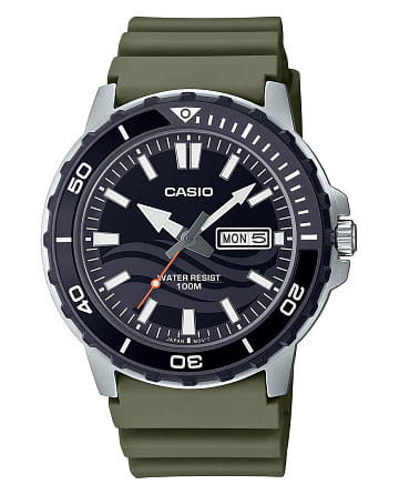 Мужские японские часы Casio MTD-125-3A, кварцевый механизм с высокой точностью. Класс водозащиты: 100 метров. Круглый стальной корпус изготовлен из нержавеющей стали. Безель c IP-покрытием черного цвета. Окошко даты на отметке 3 часа. Рифленая заводная головка. Ремешок из полимерного пластика с классической застежкой.