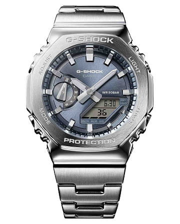 Casio G-Shock GM-2110D-8A - японские ударопрочные кварцевые часы с функцией хронографа в стальном корпусе. Установлено Минеральное стекло . Реализована двойная подсветка: стрелки с Neobrite -покрытием и отдельная LED-подсветка цифрового дисплея. Предусмотрены Мировое время (31 часовой пояс), Секундомер , Таймер , 5 ежедневных будильников, почасовой сигнал, автокалендарь до 2099 года, формат 12/24 часа. Водозащита 200 м. Стальной браслет на Раскладной застёжке .