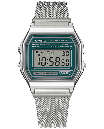 Casio A-158WEM-3 - женские кварцевые часы в ретро-стиле с цифровой индикацией. Лёгкий корпус из полимера размером 36 мм при толщине 8 мм дополнен стальной задней крышкой на четырёх винтах. Установлено Минеральное стекло . ЖК-дисплей оснащён светодиодной подсветкой с зелёным свечением. Доступен 12/24-часовой формат времени, автоматический календарь (число и день недели), Секундомер с точностью 1/100 секунды (до 1 часа) и режимом SPLIT, будильник и почасовой сигнал. Срок службы батареи - до 7 лет. Стальной браслет миланского плетения фиксируется на Раскладном замке . Водозащита 30 м. Вес модели - 52 г.